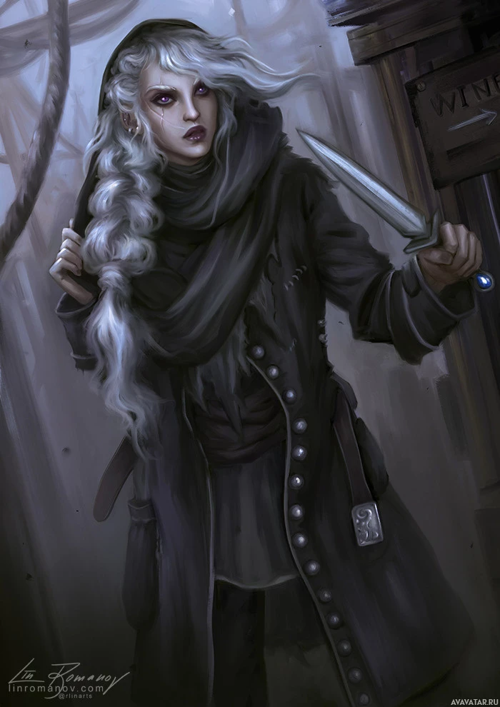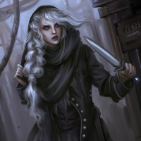 white hair, dressed in a dark outfit that gives off a steampunk or gothic vibe. She has knives held to her sides and is wearing what appears to be a mask over the lower half of her face. The background suggests
