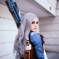 the video game "Overwatch." They are holding what appears to be a weapon similar to the one wielded by the character they are portraying. The individual is wearing a costume that includes elements of the character's design, such as the wings and the color scheme. They have long