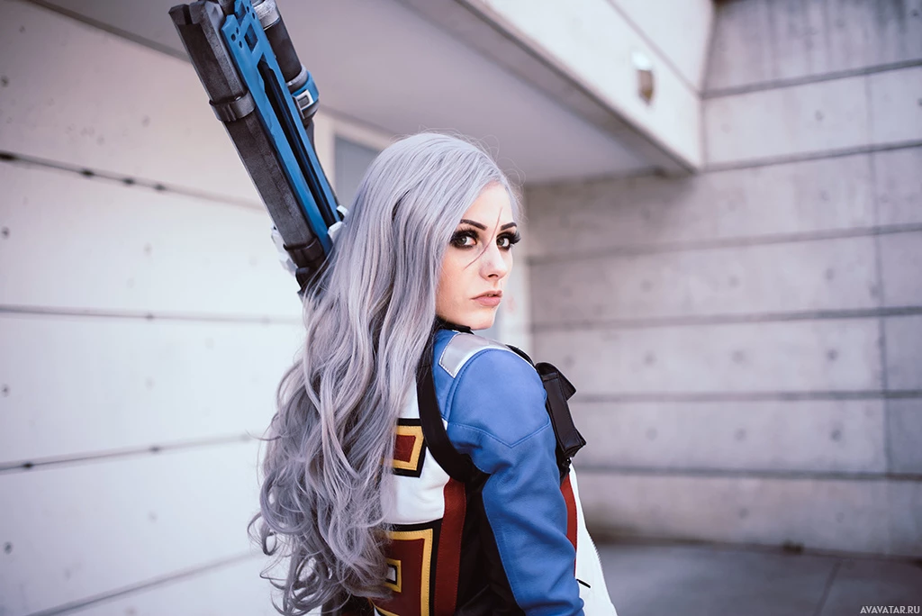 The image shows a person dressed in cosplay, emulating the character of Mercy from