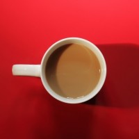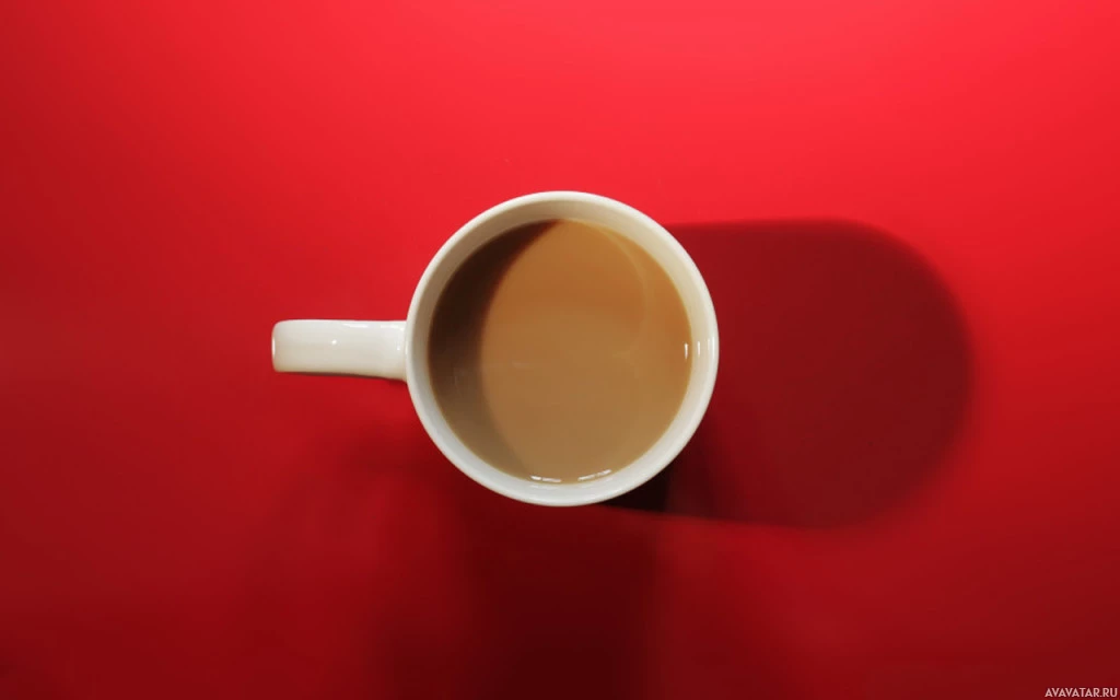 coffee mug on the left side containing a liquid, which appears to be coffee given its color and the context provided. On the right side of the mug is the shadow of the mug cast onto a surface that seems to be red or dark-colored, indicating there's likely