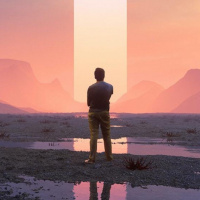 landscape in the background appears rugged and arid, with a sense of vastness and solitude. The overall mood of the picture is contemplative or introspective.