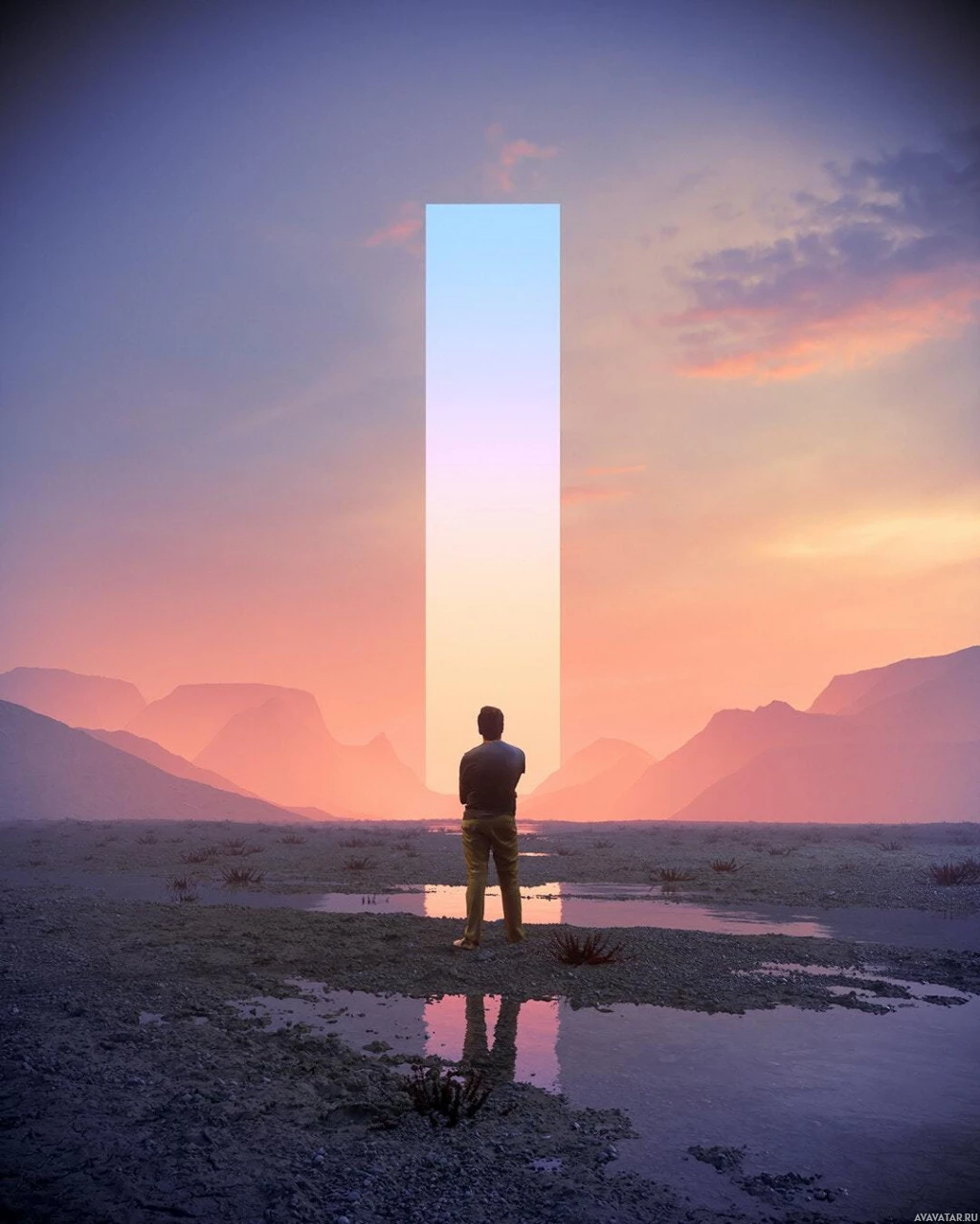 The image shows a man standing in the foreground, facing away from the viewer. He is silhouetted against