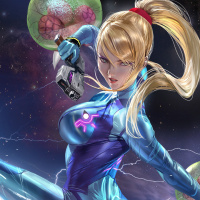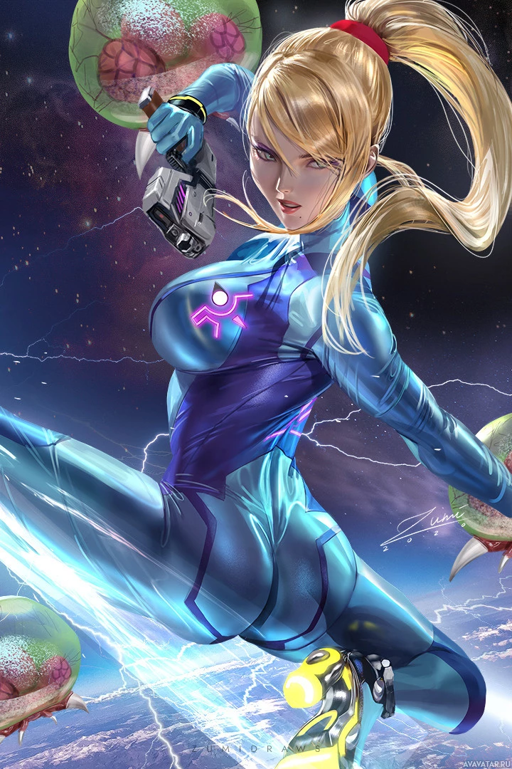 a female character who appears to be Samus Aran from the "Metroid" video game series. She is wearing her iconic