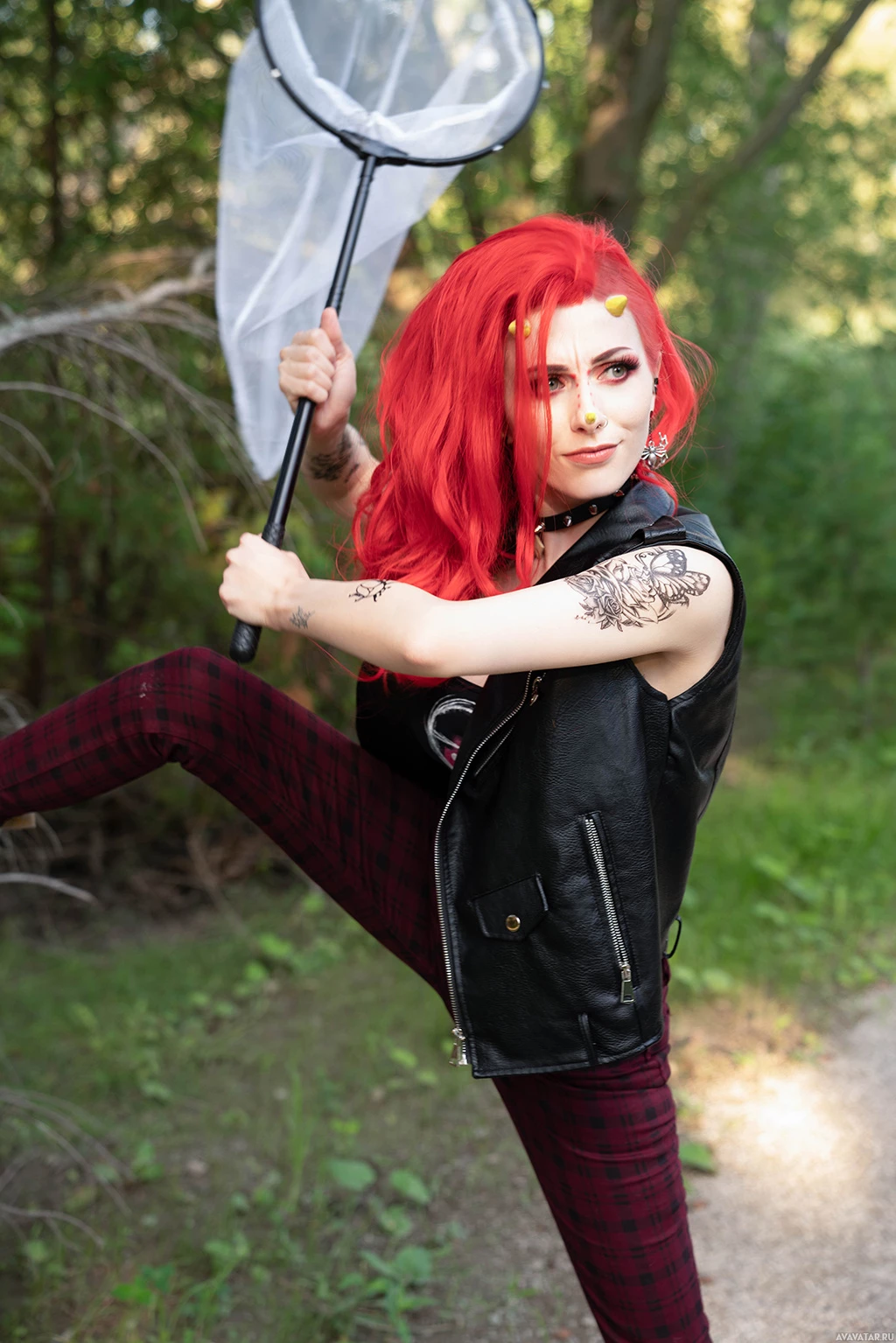 a red wig with spiked hair and makeup that matches the style of the game's characters. The person is holding what appears to be
