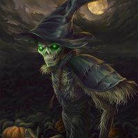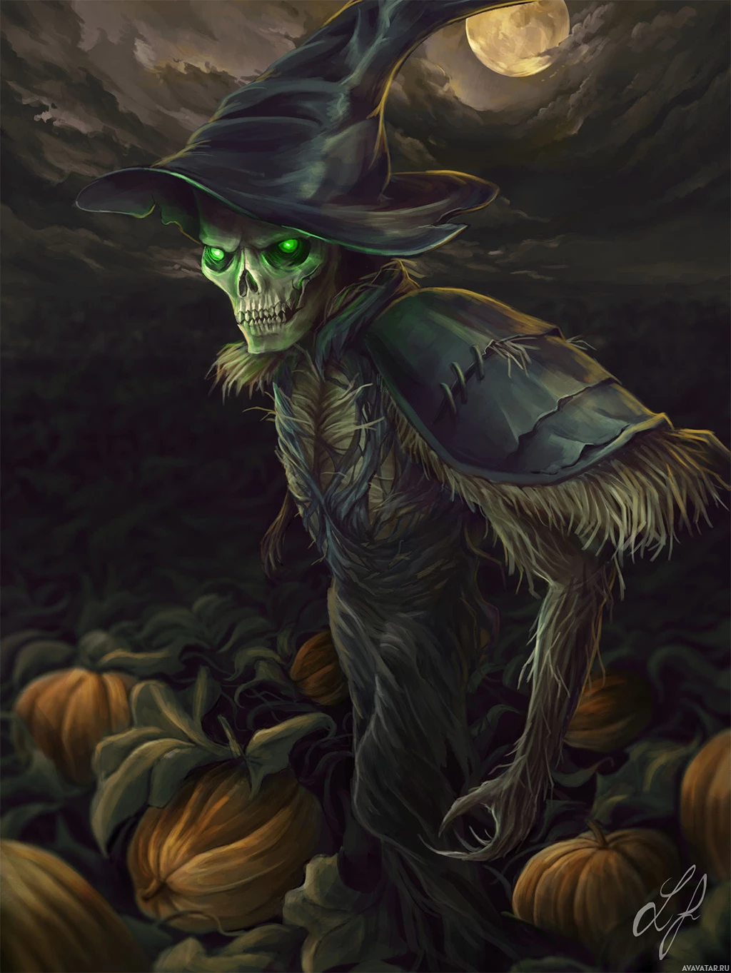 the Grim Reaper, standing in what appears to be a Halloween setting. The character is wearing a black witch hat and has green