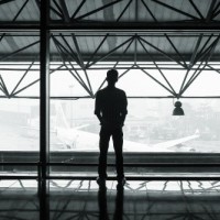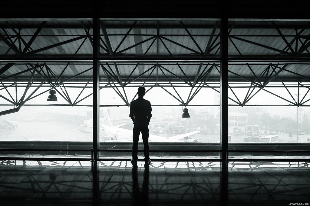 a silhouette of a person standing in what appears to be an airport or a similar terminal building. The individual is looking out through the windows at a cityscape, with buildings visible under