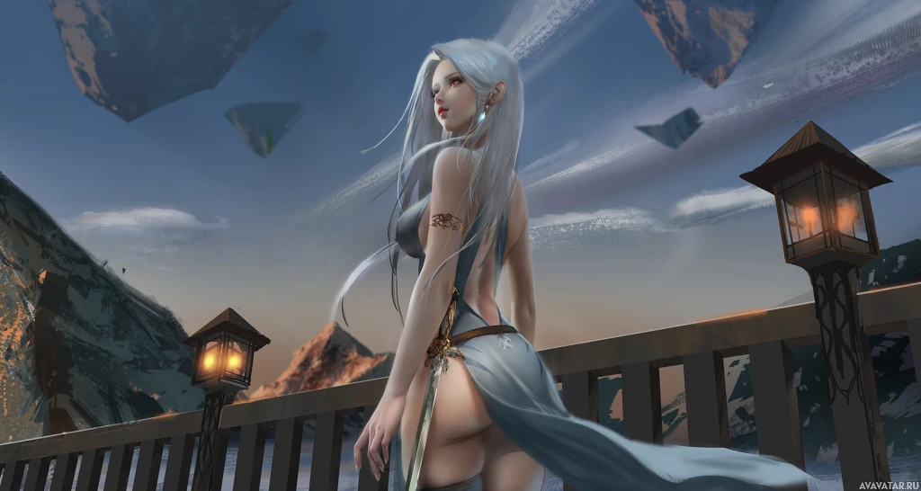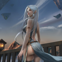 white hair and is wearing some kind of armor or outfit that suggests she might be in a fantasy or historical setting, possibly a warrior or an adventurer given the appearance of her attire. Her pose indicates