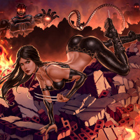The image features an illustrated character who appears to be X-23, a member of the X-Men. She is depicted in a dynamic pose that suggests action and intensity. The background includes fiery destruction, indicating a battle or chaotic scene typical of comic book heroines.