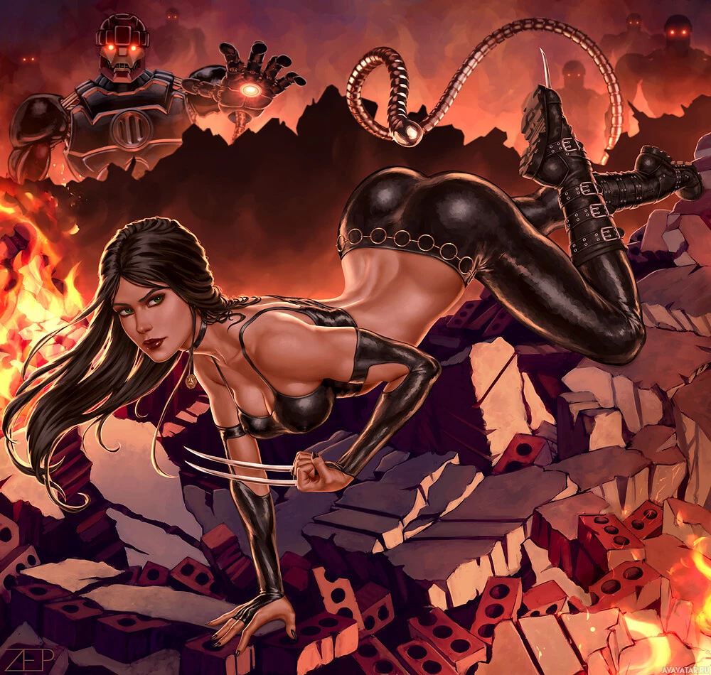 На картинке изображен персонаж, который, по-видимому, является Икс-23, членом Людей Икс. Она изображена в динамичной позе, которая предполагает действие и напряженность. На заднем плане изображены огненные разрушения, что указывает на битву или хаотическую сцену, типичную для героинь комиксов.