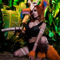 animal ears that resemble those of a fox or similar creature. Her attire includes elements suggestive of fantasy or cosplay, such as a black and red top with what appears to be a tribal design on it, and she has body paint on her skin, possibly representing tattoos or markings from