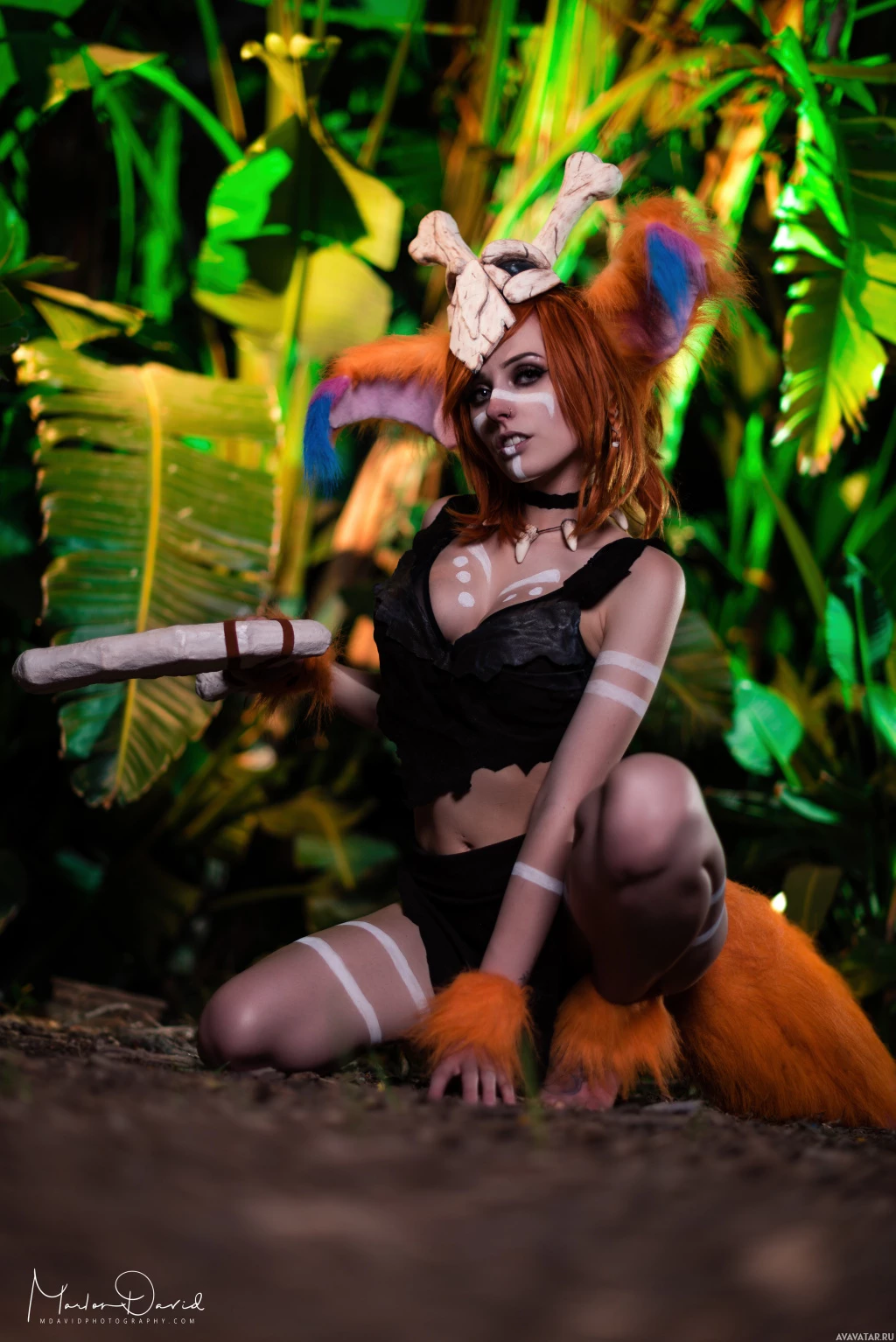 League of Legends." Her pose and expression suggest confidence and playfulness, fitting for