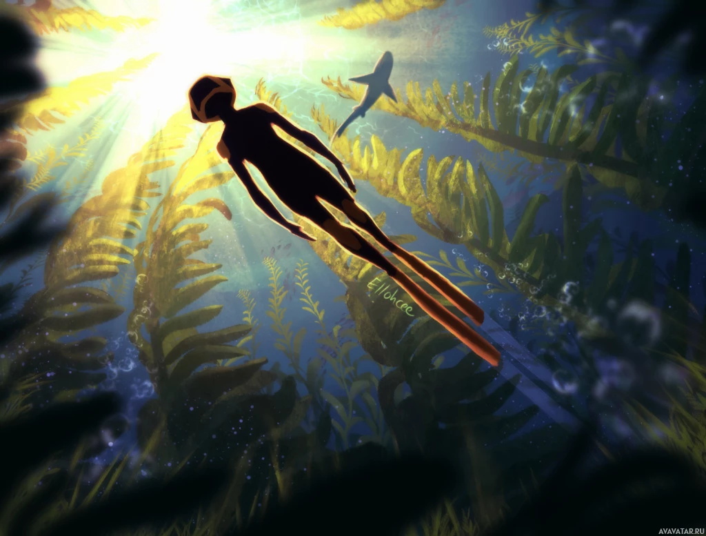 На картинке виден силуэт ныряльщика под водой, на фоне лучей света, пробивающихся сквозь поверхность воды над ним. В кадре также присутствует акула, плавающая неподалеку. Кажется, что ныряльщик смотрит вверх, на солнечный свет, падающий сверху.