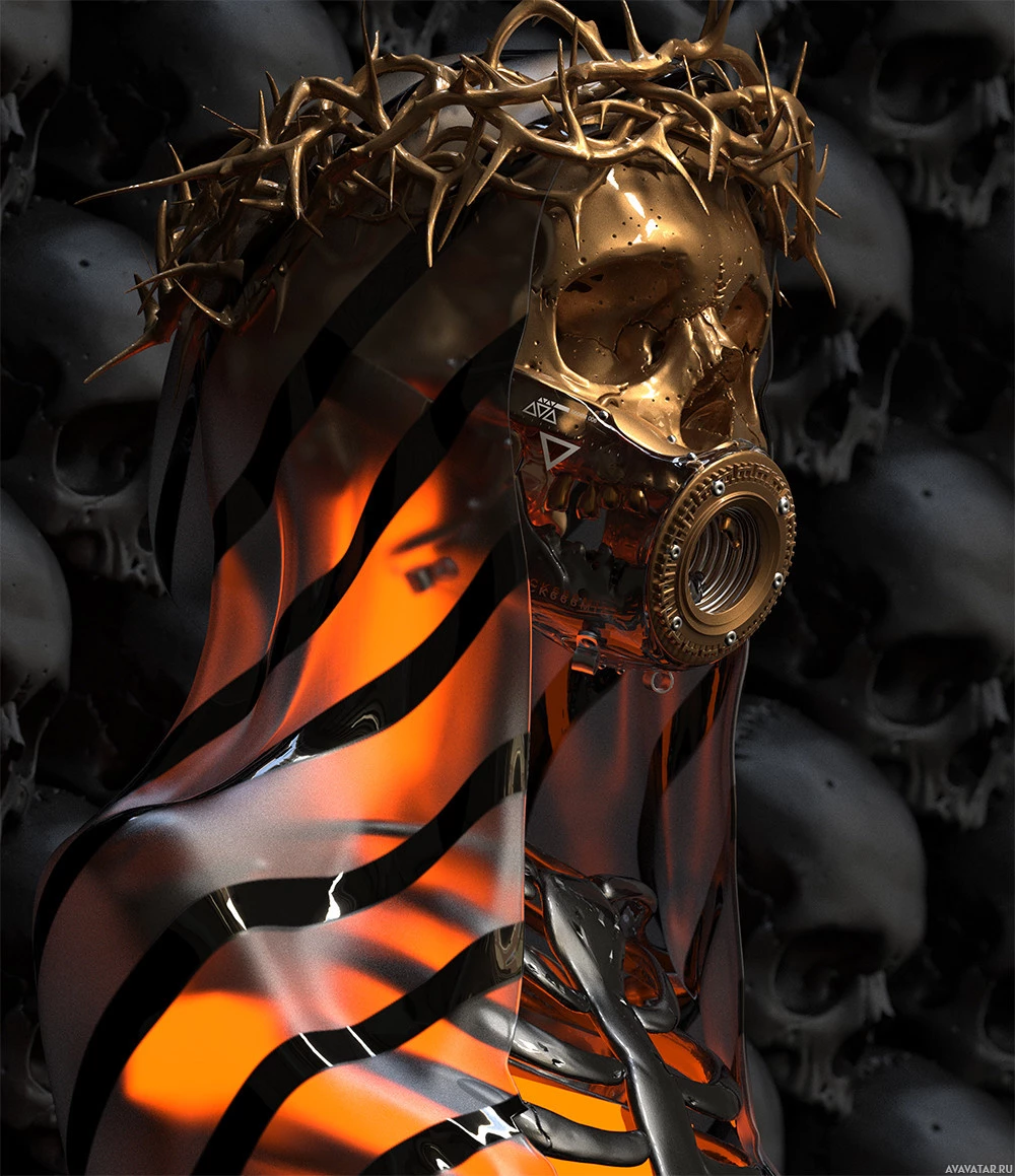 gritty texture that could be interpreted as a representation of chaos, death, or the void. This image might be seen as a commentary on religion, identity, or the intersection of faith and technology, among other interpretations depending on the viewer's perspective.