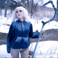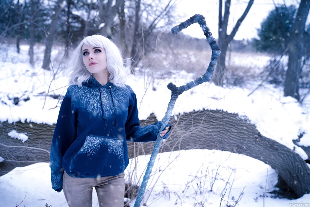 hooded sweatshirt and has ice crystals on their clothes, suggesting they are either portraying a character from a story or experiencing a cold weather scene. They are holding what looks like a staff or walking stick in one hand and have the other arm extended as if reaching for something. There is a blurry background that suggests