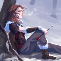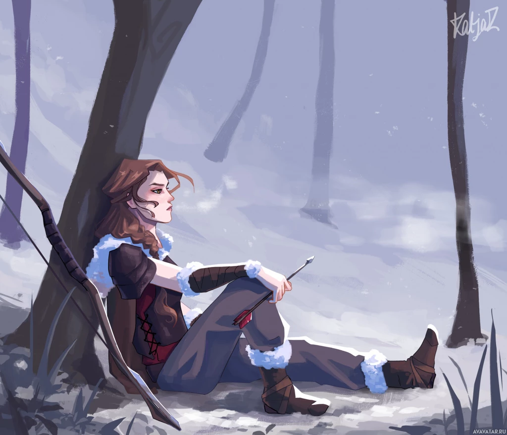 red hair tied back and is wearing an outfit that might suggest she is a hunter or a warrior of some sort, as indicated by the bow she holds beside her on the ground. The character is looking off to one side with a contemplative or perhaps sad expression.