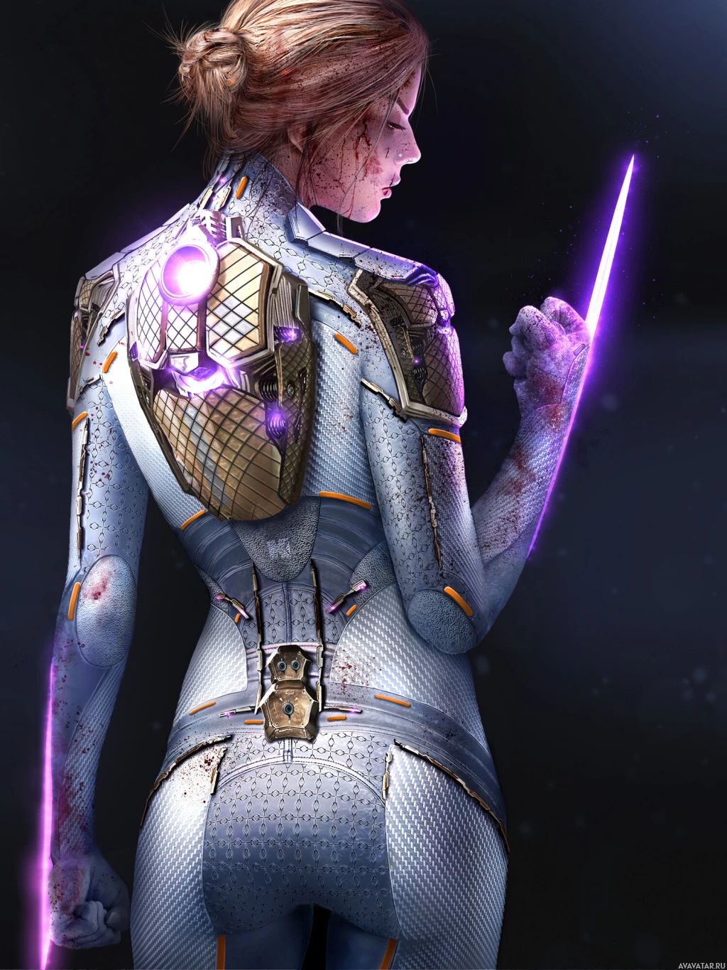 armor suit with metallic and purple accents. The backdrop suggests