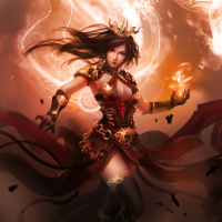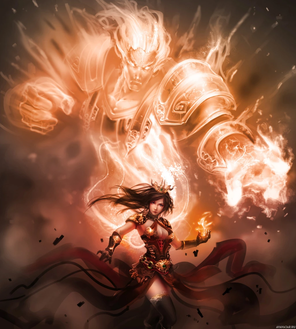 glowing eyes and flames, which suggests they might be a demonic or powerful entity. The background has dark and fiery elements, adding to