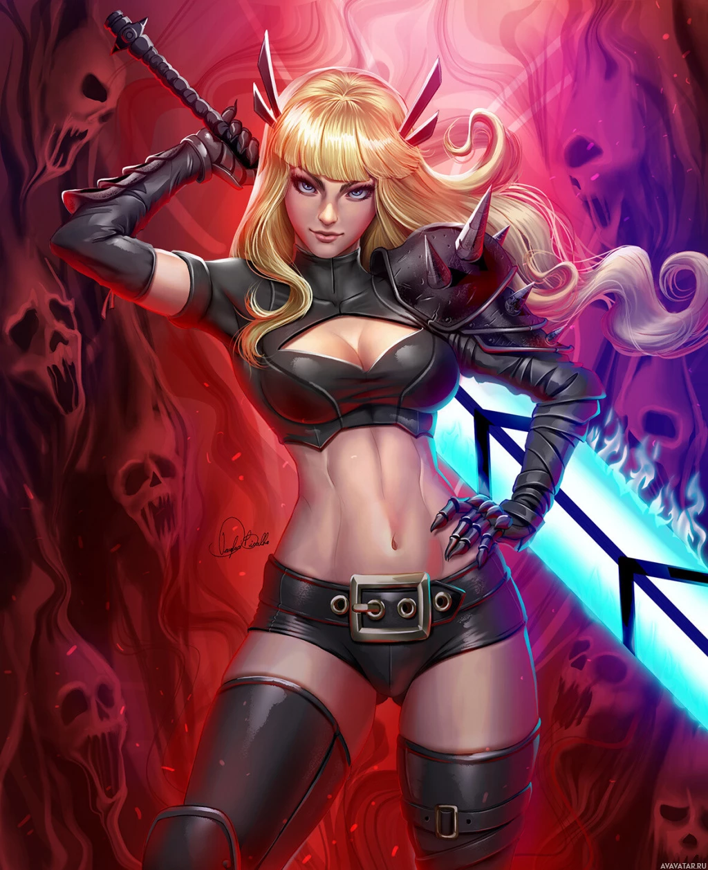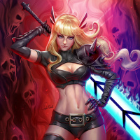 a female character wearing a black armored outfit, possibly resembling a fantasy or warrior-themed costume. She is holding what appears to be a sword with her right hand. Her hair is blonde and she has