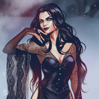 The image shows a stylized illustration of a female character. She has long dark hair and is wearing an elegant black dress with intricate details. Her pose suggests confidence, and she appears to be standing in front of what seems to be snow-covered ground or a body of water, given the misty environment around her. The red lighting adds a moody atmosphere to the scene.