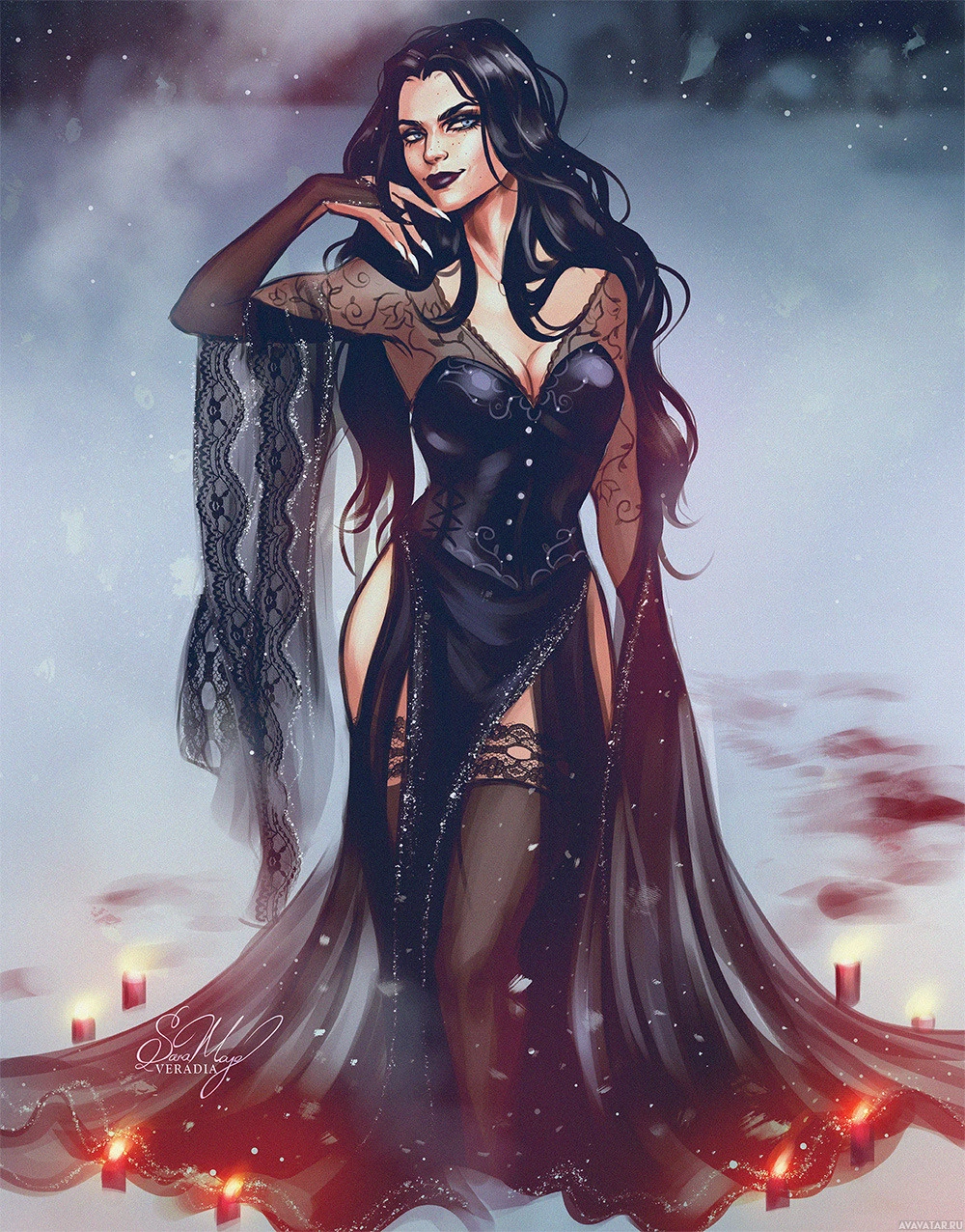 На картинке изображена стилизованная иллюстрация женского персонажа. У нее длинные темные волосы, и она одета в элегантное черное платье с замысловатыми деталями. Ее поза говорит об уверенности, и кажется, что она стоит перед чем-то похожим на покрытую снегом землю или водоем, учитывая туманную обстановку вокруг нее. Красное освещение придает сцене мрачную атмосферу.