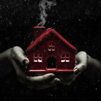 red house decoration. There is smoke emanating from the chimney, indicating that it is lit up and potentially functional as