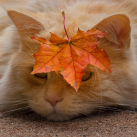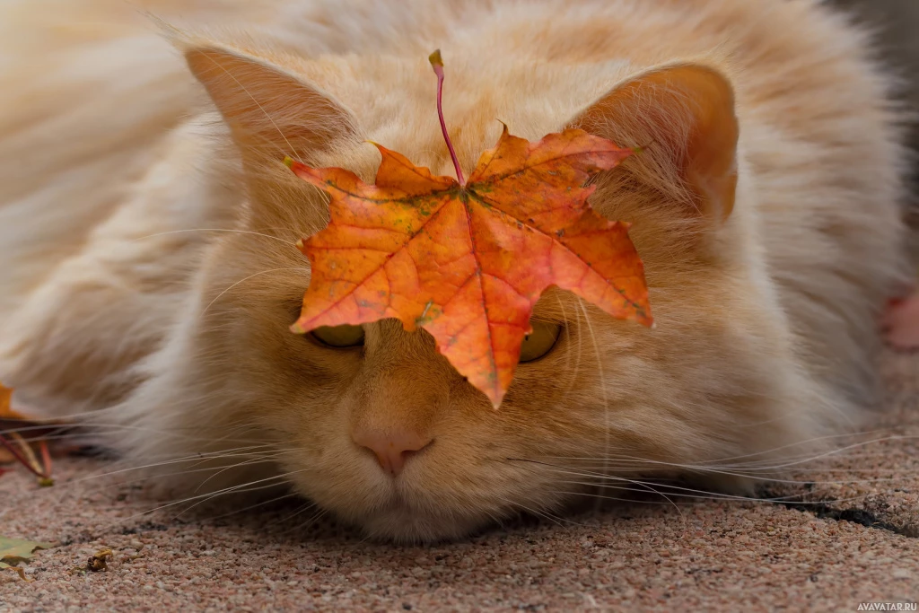 fallen leaves create colorful displays. The cat appears relaxed and content in this