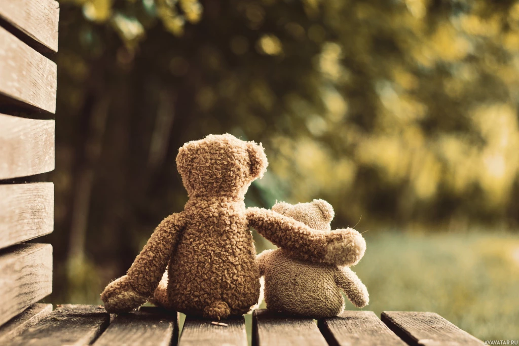 teddy bears sitting on a bench. One bear is positioned upright and the other one is leaning against the first bear, as if they are embracing or hugging each other. They both appear to have a soft and cuddly texture, typical of plush teddy bears. The background suggests