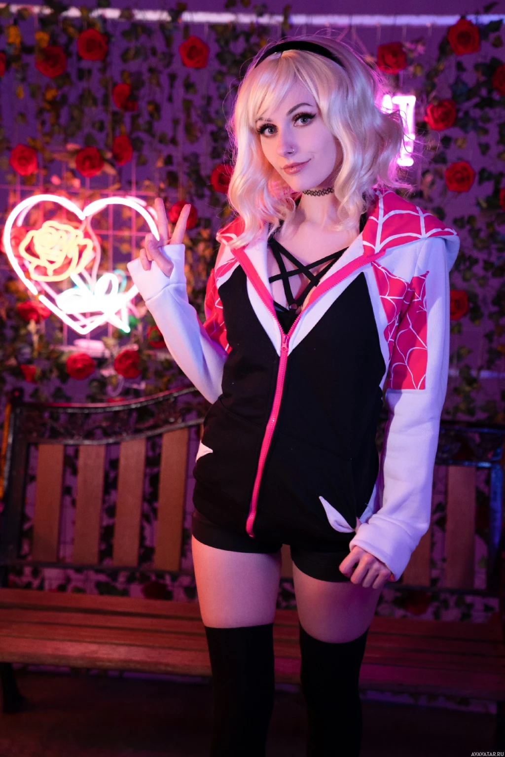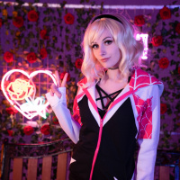 blonde hair styled with bangs and darker hair at the back, wearing a costume that includes elements associated with Gwen's character such as a black top with white lines, a pink scarf, and a short skirt. Additionally, there is a peace