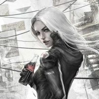 an urban environment with overcast weather conditions, possibly during winter given the presence of snow. The character is depicted from behind and appears to be in motion or action. The overall style has a blend of realistic features with some digital art embellishments that give it