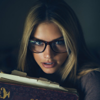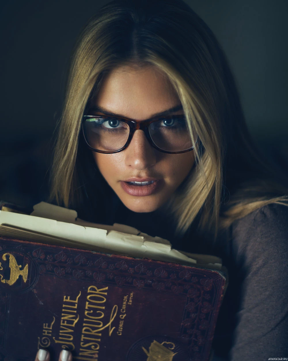 blonde hair and appears to be reading an old book or manuscript, which might suggest she is engaged in some sort of research or study, possibly historical or literary. The book seems to have a title on it that says "Instructions," indicating that the content might provide instructions or guidelines for something, but