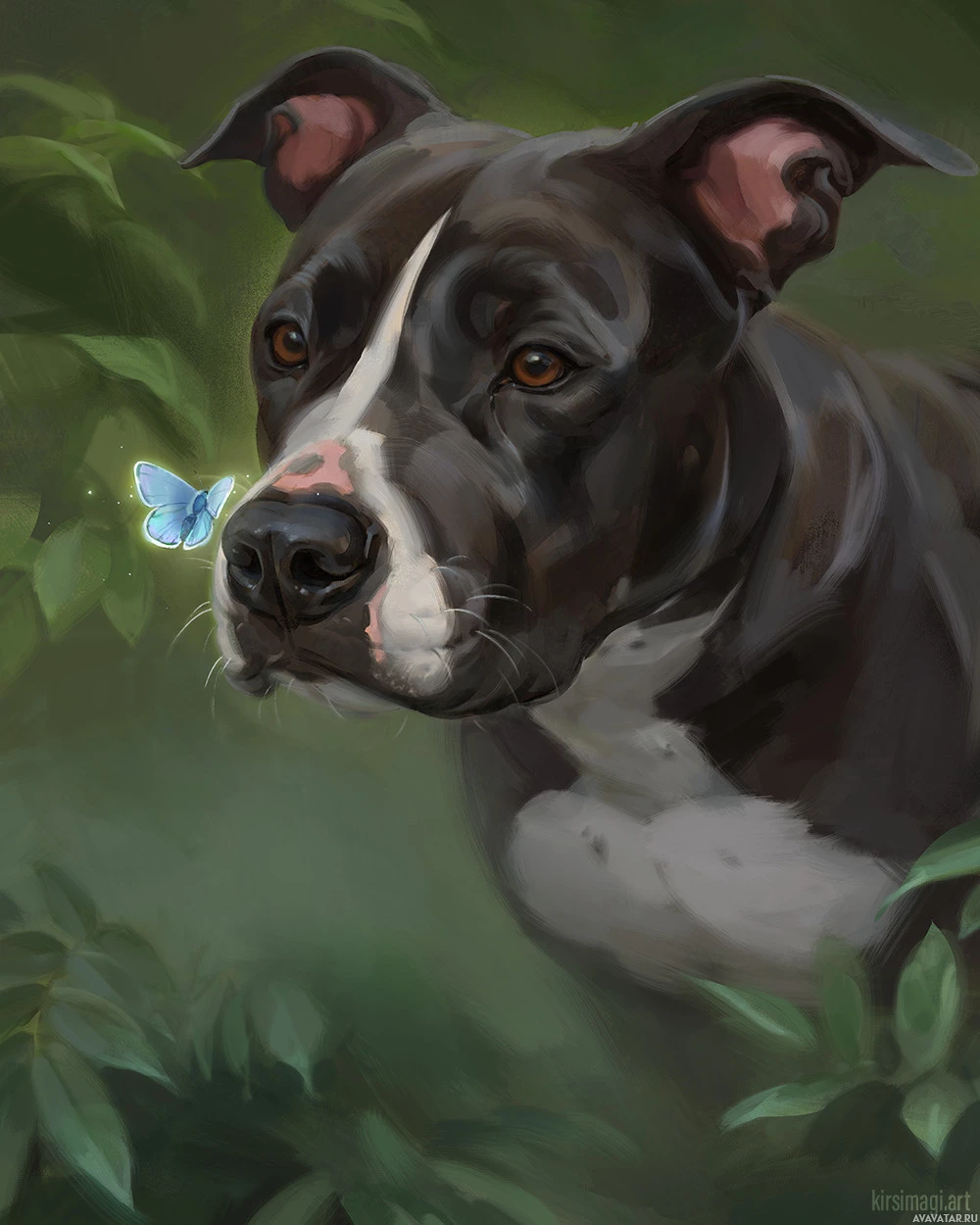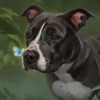 blue butterfly close to the dog's nose, which adds a sense of connection between the animal and nature.