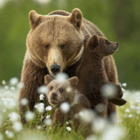 tall grass and flowers. There are three bears visible: