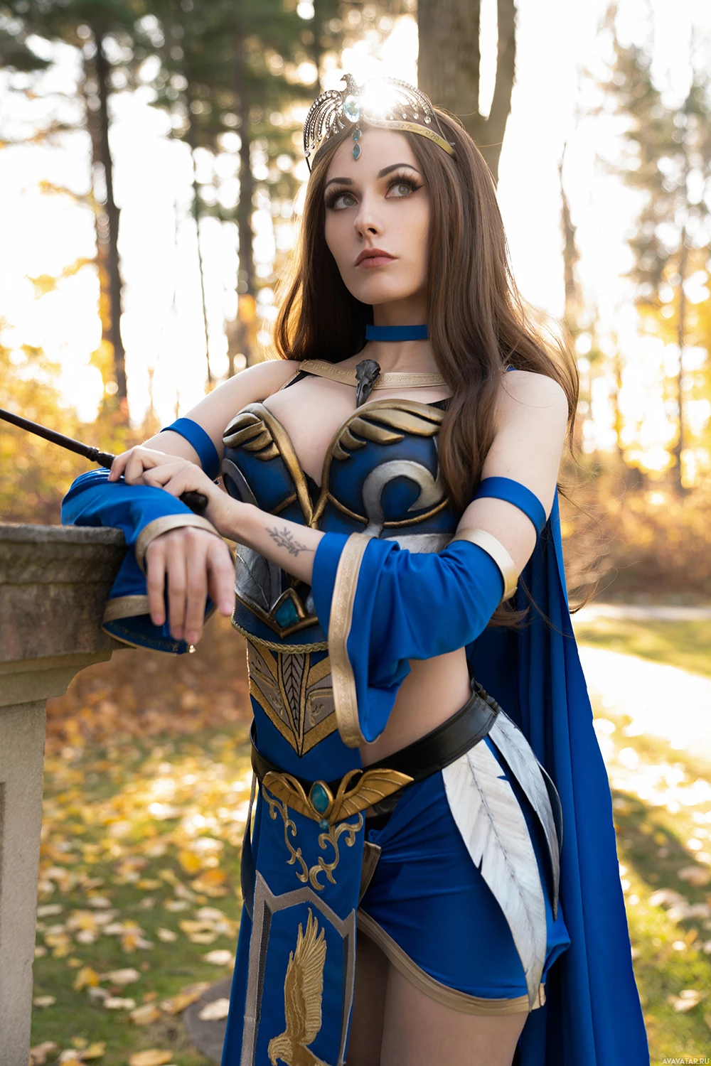The image shows a person wearing elaborate