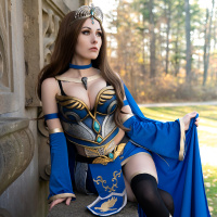 natural environment. The cosplay includes a detailed headpiece, armor, cape, and accessories that are part of the character's appearance in the context from which she is being portrayed.