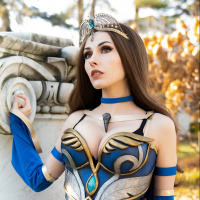 an animated character. The costume includes fantasy-style armor with blue and gold colors, along with accessories that resemble those from the original