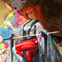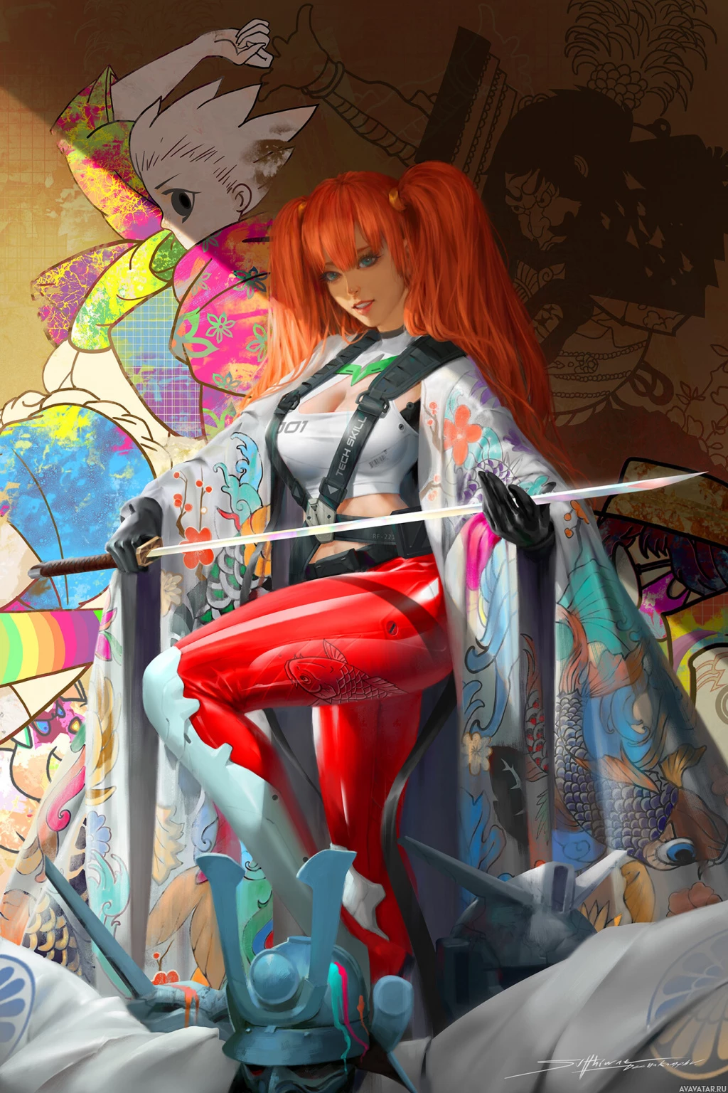 a female character who appears to be styled in elements reminiscent of traditional Japanese samurai or geisha attire, with red hair and a confident demeanor. She is holding a sword, which suggests she might be a warrior or a guardian. The background features a colorful and somewhat chaotic scene that contrasts with her poised appearance. There are various elements like flowers, fish, and