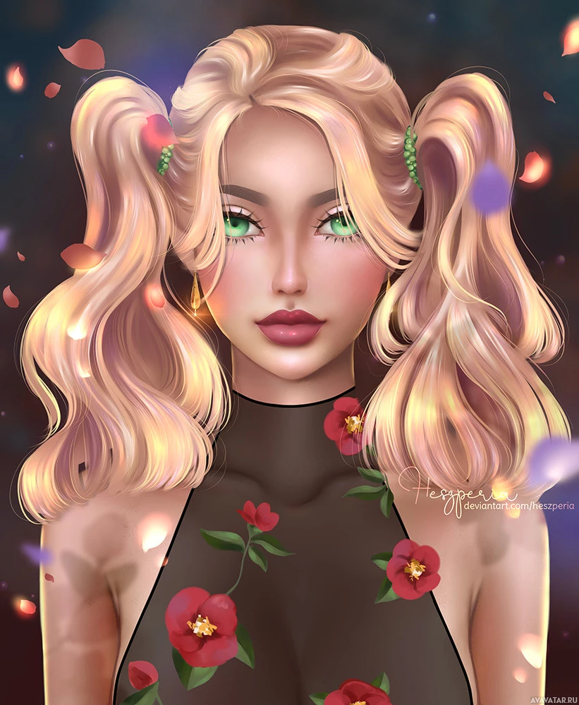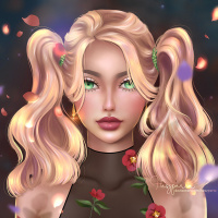 blue eyes and is adorned with what appears to be red flowers or petals around her head, adding a whimsical touch to the overall design. The character is depicted in a portrait-style illustration against a dark background that hints at a starry