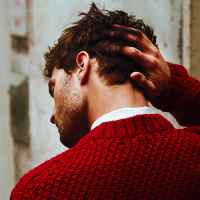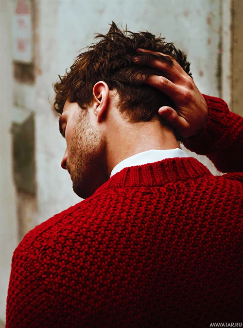 a red sweater or cardigan and is leaning slightly forward with his hand on his head as if scratching or resting it. The background suggests