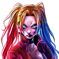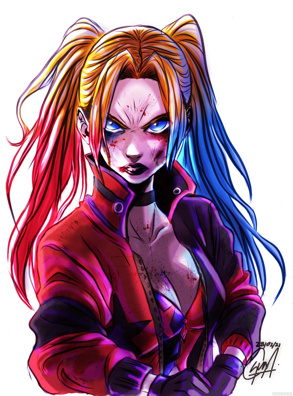 Harley Quinn, a fictional character from the DC Comics universe. She is shown with her characteristic red and blue hair tied in ponytails, wearing a red jacket over