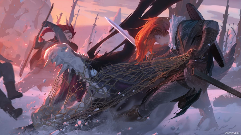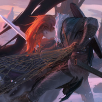 red hair who seems to be wielding a sword and looking back over her shoulder at another character. This character appears to be wearing armor and holding what looks like a staff or spear, possibly indicating a defensive or supportive role in the scene. The background suggests