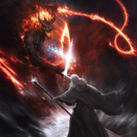 a dramatic scene from Middle-earth, featuring the character Gandalf and a powerful creature known as a Balrog. Gandalf is seen in the act of casting a spell or incantation with a staff, while the Balrog appears to be countering the spell with its own