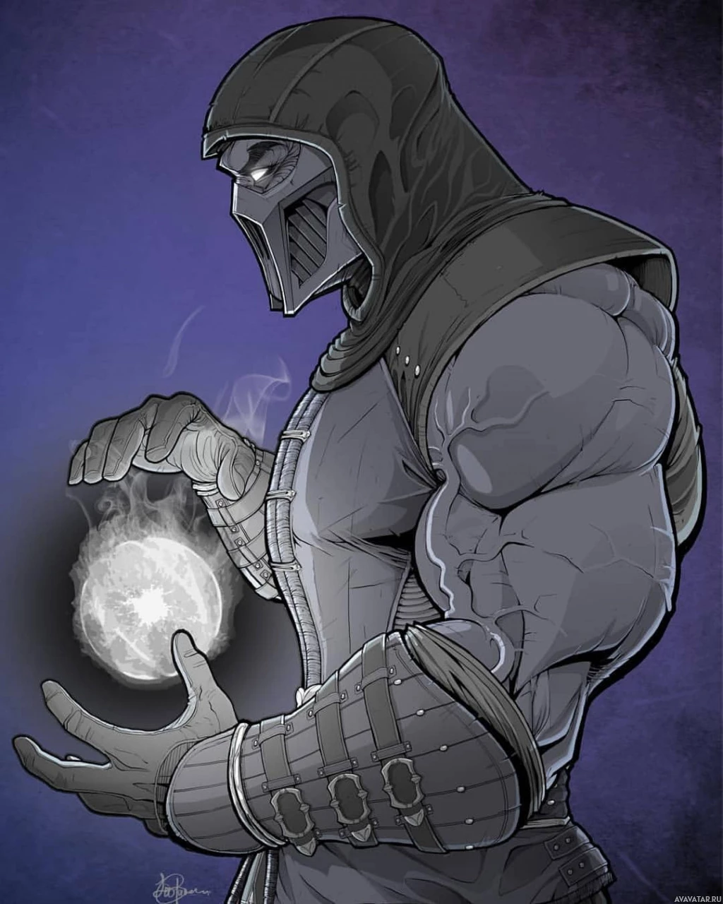 unique attire and appearance, which includes a mask and armor that give him a somewhat gothic or mystical look. He's holding what appears to be a magical or elemental sphere in his right hand, suggesting he may have some kind of magical or