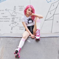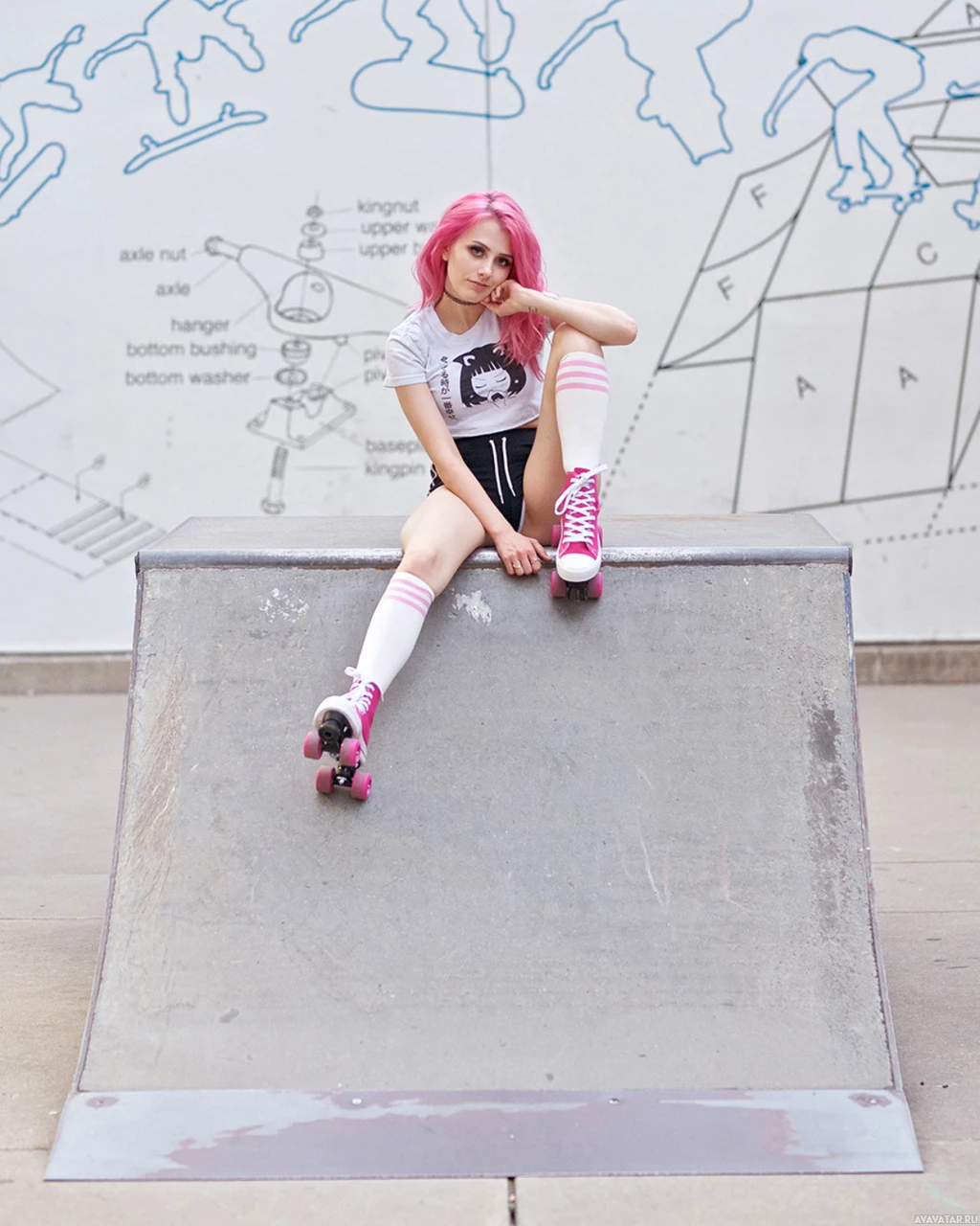 pink hair sitting on the edge of a skateboard ramp. They are wearing rollerblades, and their legs are crossed over each other. In the background, there appears to be