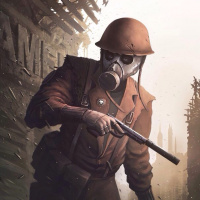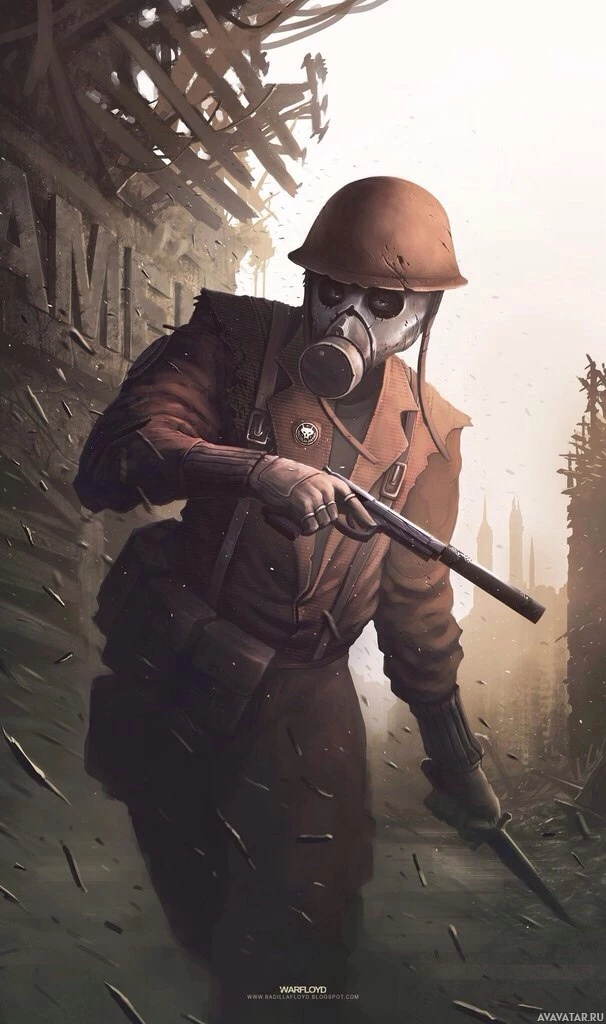 military attire with a helmet and gas mask, suggesting exposure to chemical warfare or battlefield conditions requiring protection from gases or dust. He is holding a rifle at the ready, indicating he might be on duty or preparing for combat. The art style is reminiscent of classic wartime propaganda posters, with a focus on realism and mood to convey