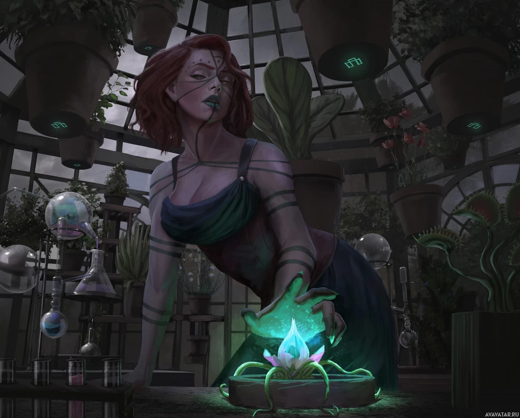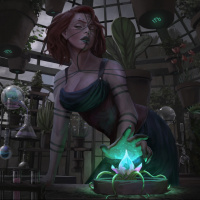 a blend of fantasy and science, indicating that the character might be involved in some sort of alchemical or magical research. The overall atmosphere is mysterious and enigmatic, fitting well within the fantasy genre.