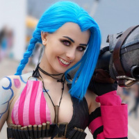 League of Legends." They are dressed in a costume that closely resembles Jinx's design, including her distinctive