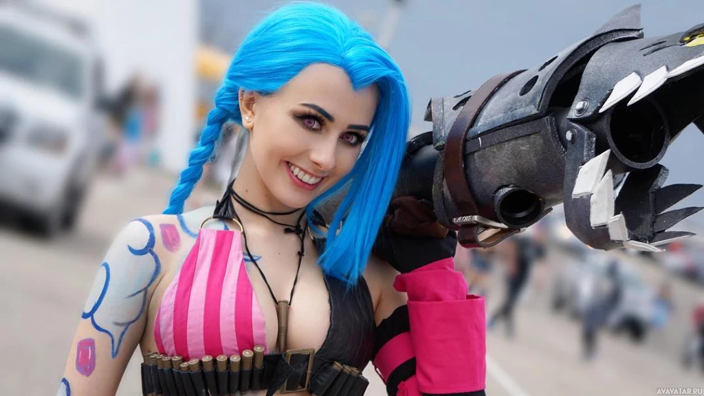 The image features a person cosplaying as Jinx, a character from the game "