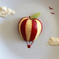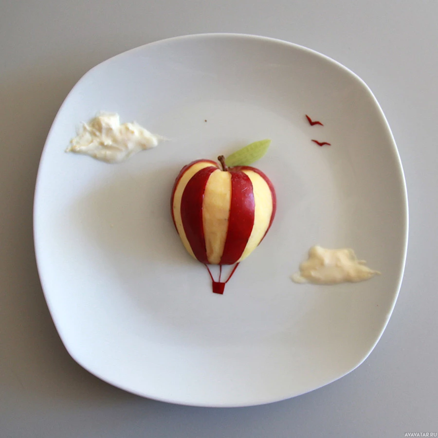 a whimsical manner that makes it look like an apple-shaped pastry. The plate itself is white, which contrasts nicely with the apple's