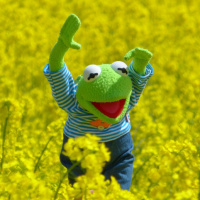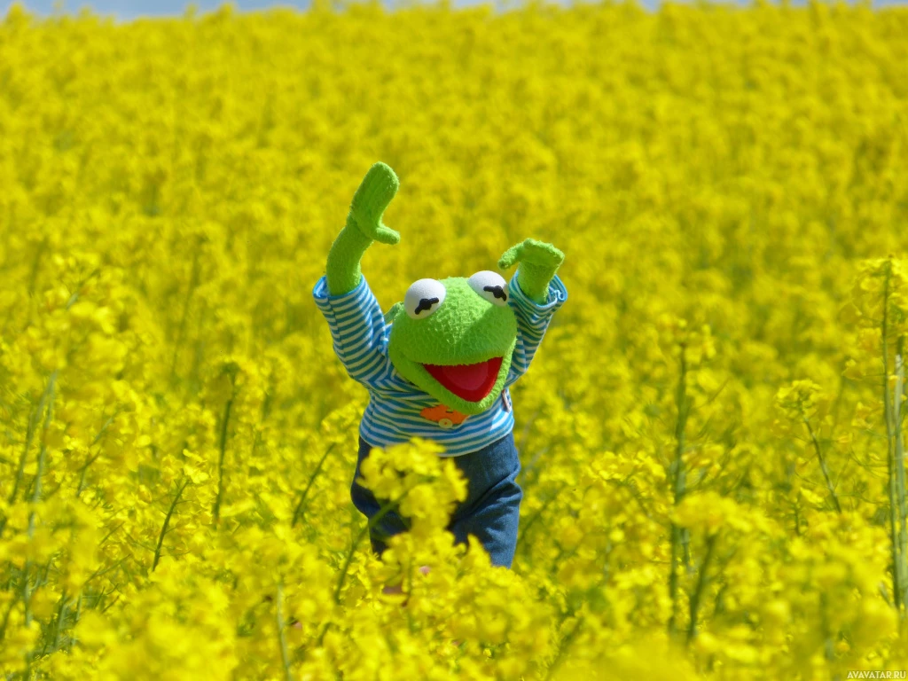 На картинке изображен персонаж из франшизы «Маппеты», Кермит Лягушка. Он стоит в поле высоких желтых цветов. Похоже, он позирует для картины с поднятыми руками.