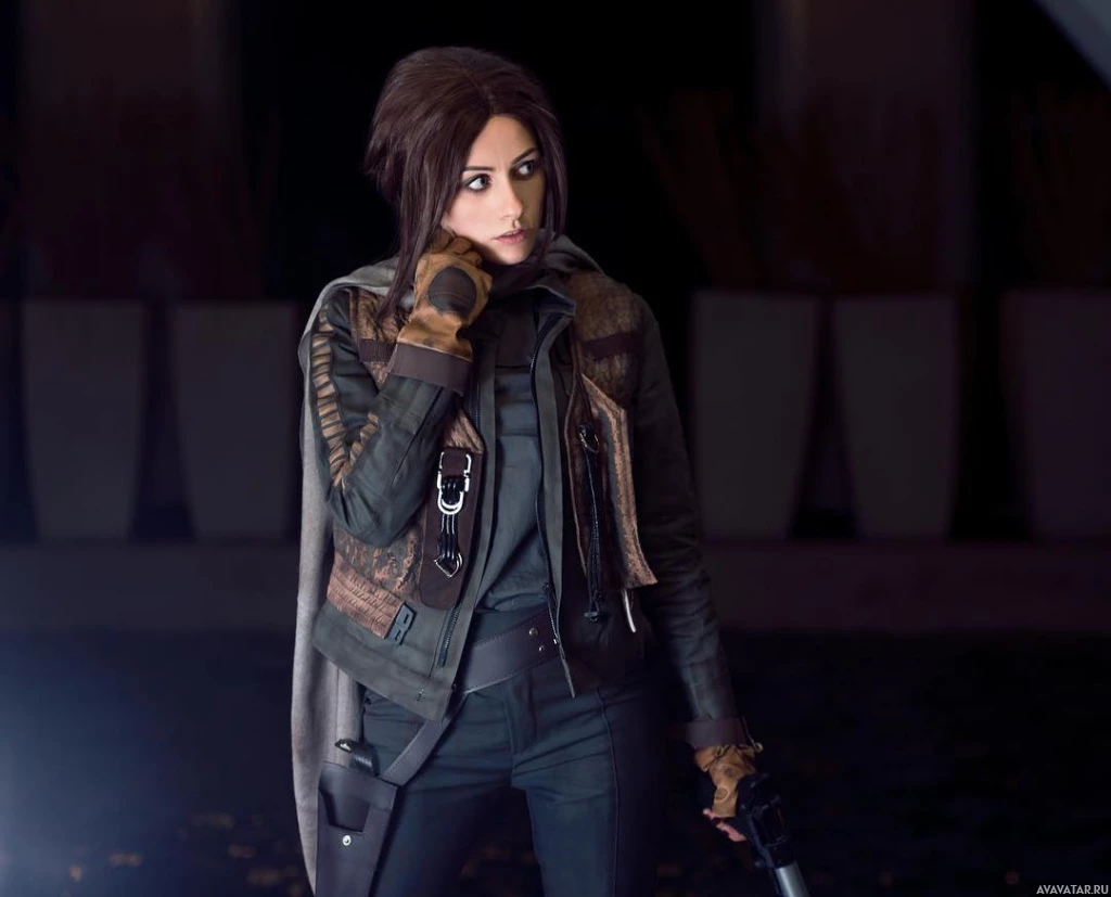Star Wars" franchise, specifically reminiscent of the clothing style seen on characters like Leia Organa. This character is wearing a jacket with military-style details, a cap, and has accessories such as a belt or utility belt that might be associated with Star